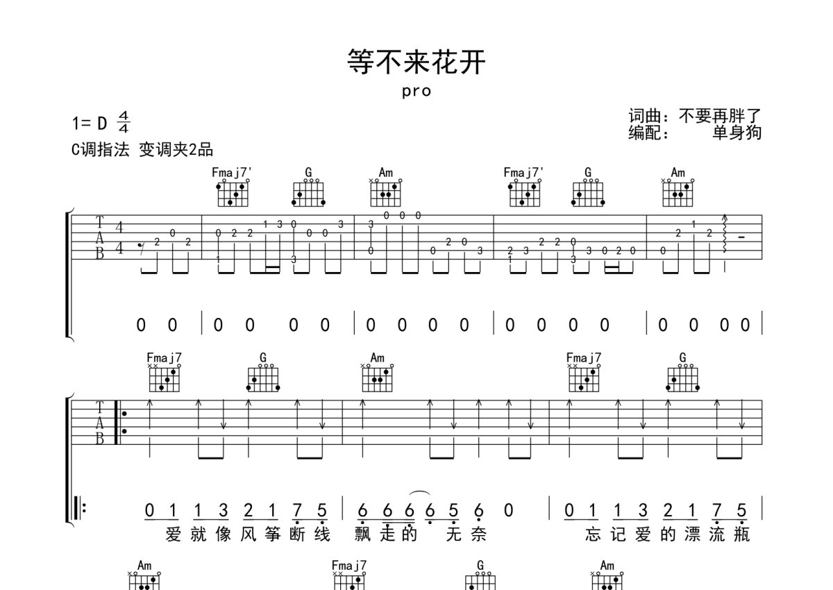 pro《等不来花开》吉他谱 - C调弹唱六线谱