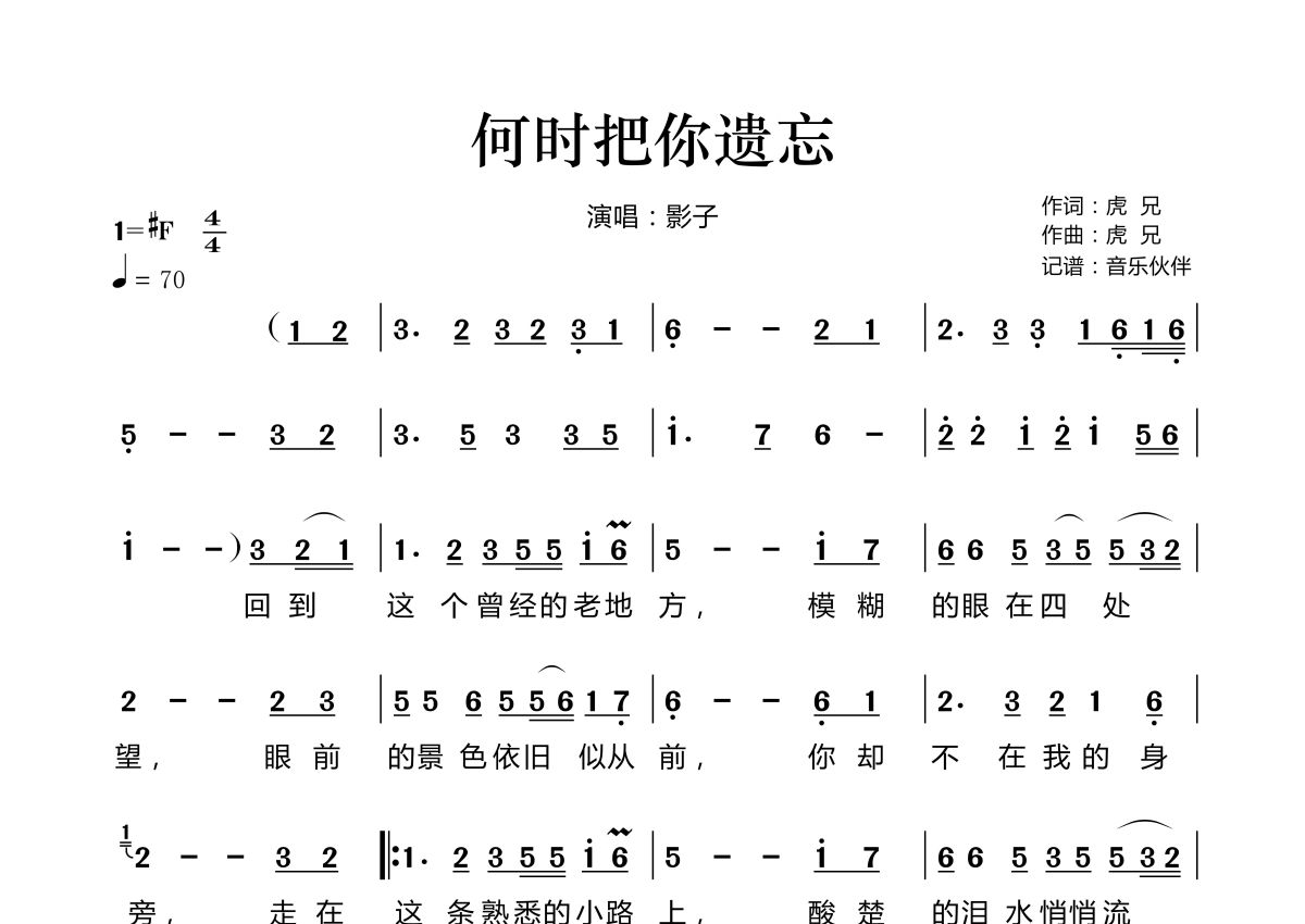 《何时把你遗忘》是影子演唱的一首歌曲,拍号为4/4拍,歌曲速度为每分钟70拍,这份简谱共有两张高清图谱,图谱由 @音乐伙伴 编配上传。