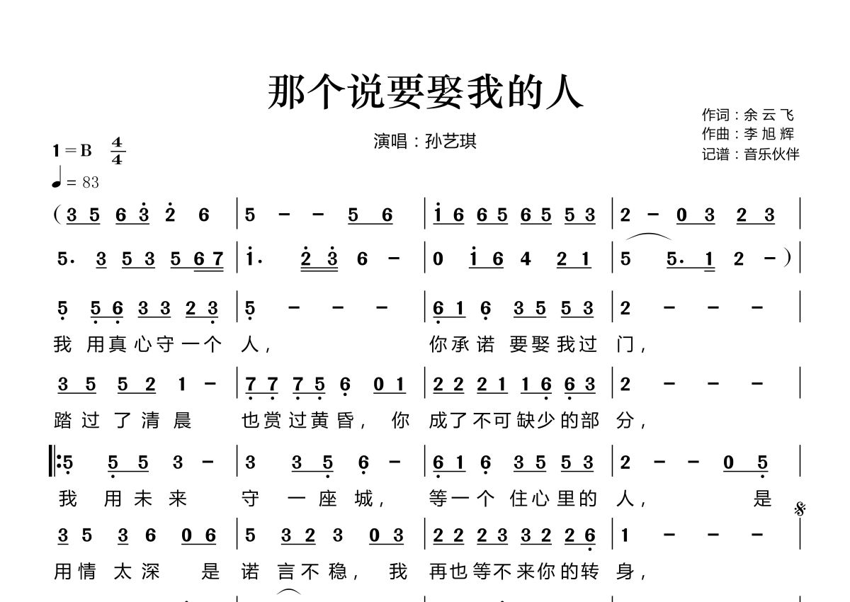 《那个说要娶我的人》是孙艺琪演唱的一首歌曲,这份简谱共有一张高清图谱,图谱由 @音乐伙伴 编配上传。