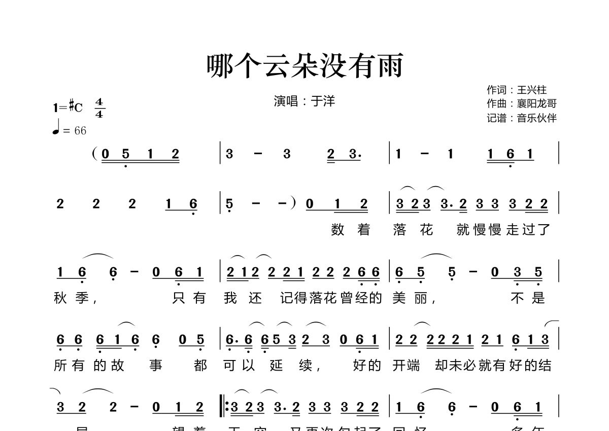 《哪个云朵没有雨》是于洋演唱的一首歌曲,拍号为4/4拍,歌曲速度为每分钟66拍,这份简谱共有两张高清图谱,图谱由 @音乐伙伴 编配上传。