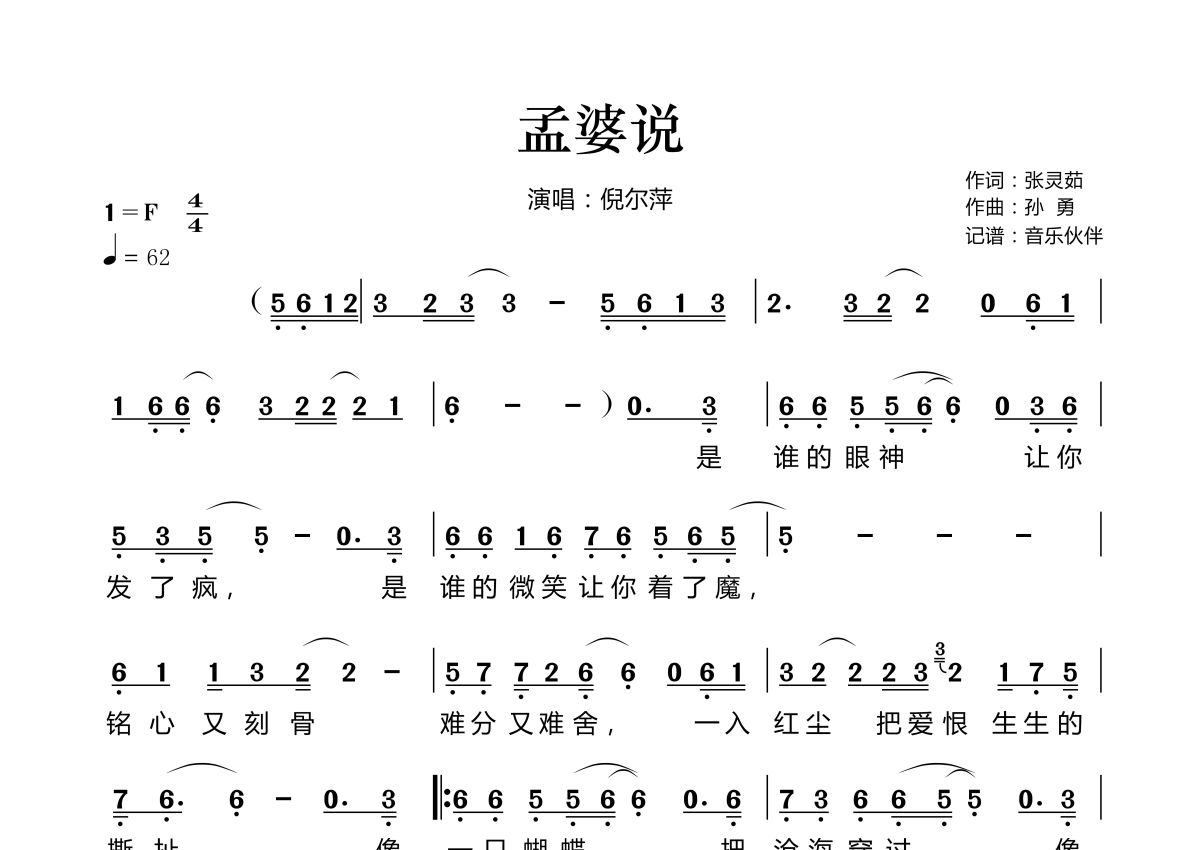 《孟婆说》是倪尔萍演唱的一首歌曲,拍号为4/4拍,歌曲速度为每分钟62拍,这份简谱共有两张高清图谱,图谱由 @音乐伙伴 编配上传。