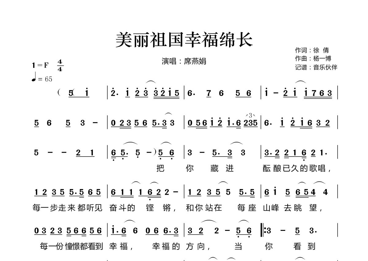 《美丽祖国幸福绵长》是席燕娟演唱的一首歌曲,拍号为4/4拍,歌曲速度为每分钟65拍,这份简谱共有两张高清图谱,图谱由 @音乐伙伴 编配上传。