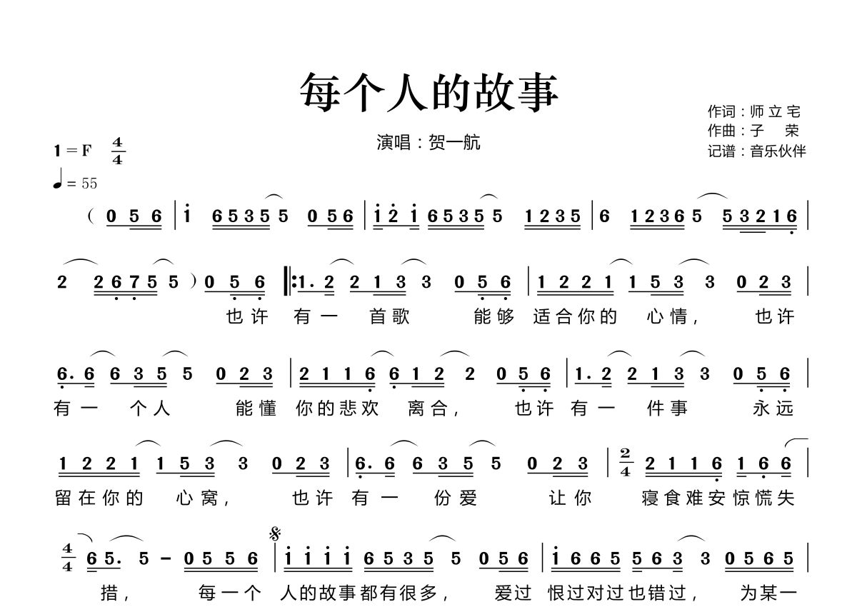每个人的故事简谱 - 贺一航演唱