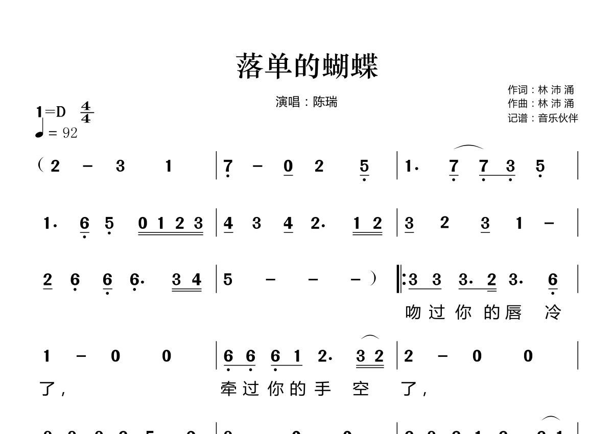 《落单的蝴蝶》是陈瑞演唱的一首歌曲,这份简谱共有两张高清图谱,图谱由 @音乐伙伴 编配上传。