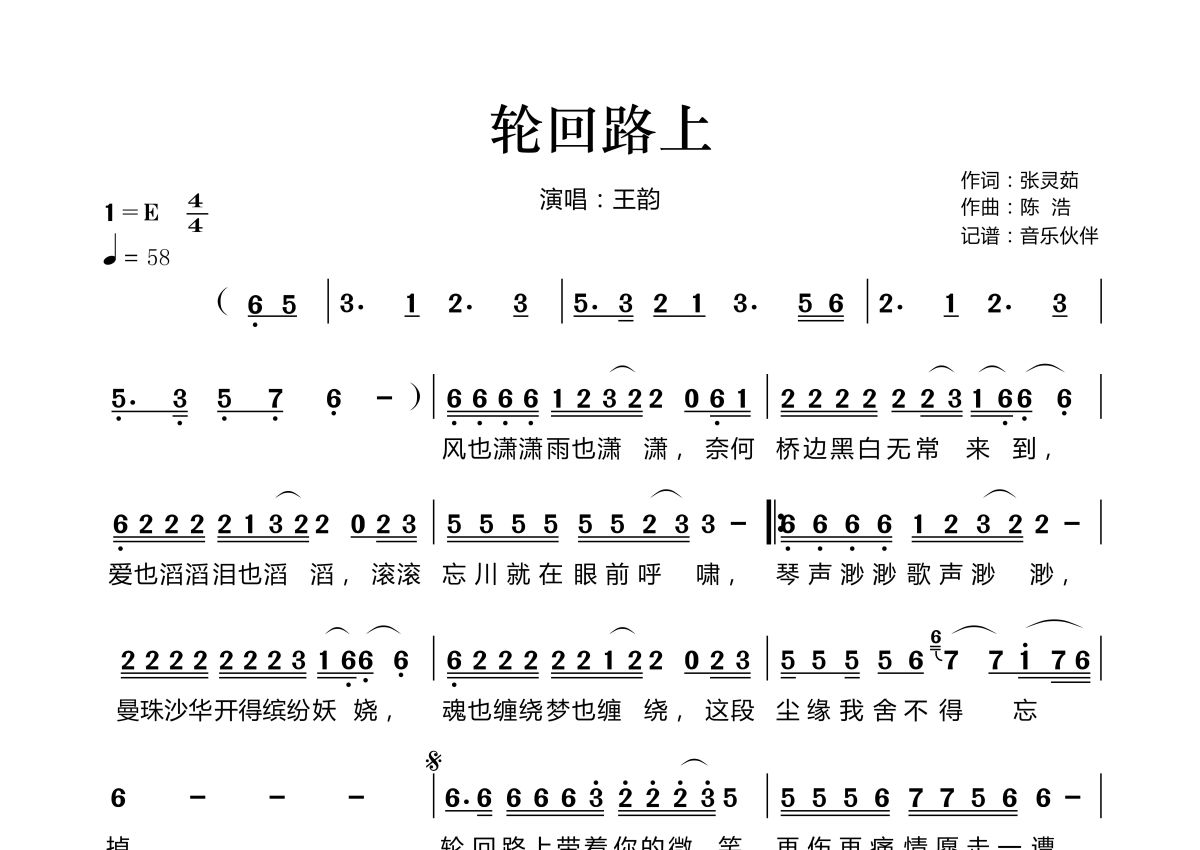 《轮回路上》是王韵演唱的一首歌曲,拍号为4/4拍,歌曲速度为每分钟58拍,这份简谱共有一张高清图谱,图谱由 @音乐伙伴 编配上传。