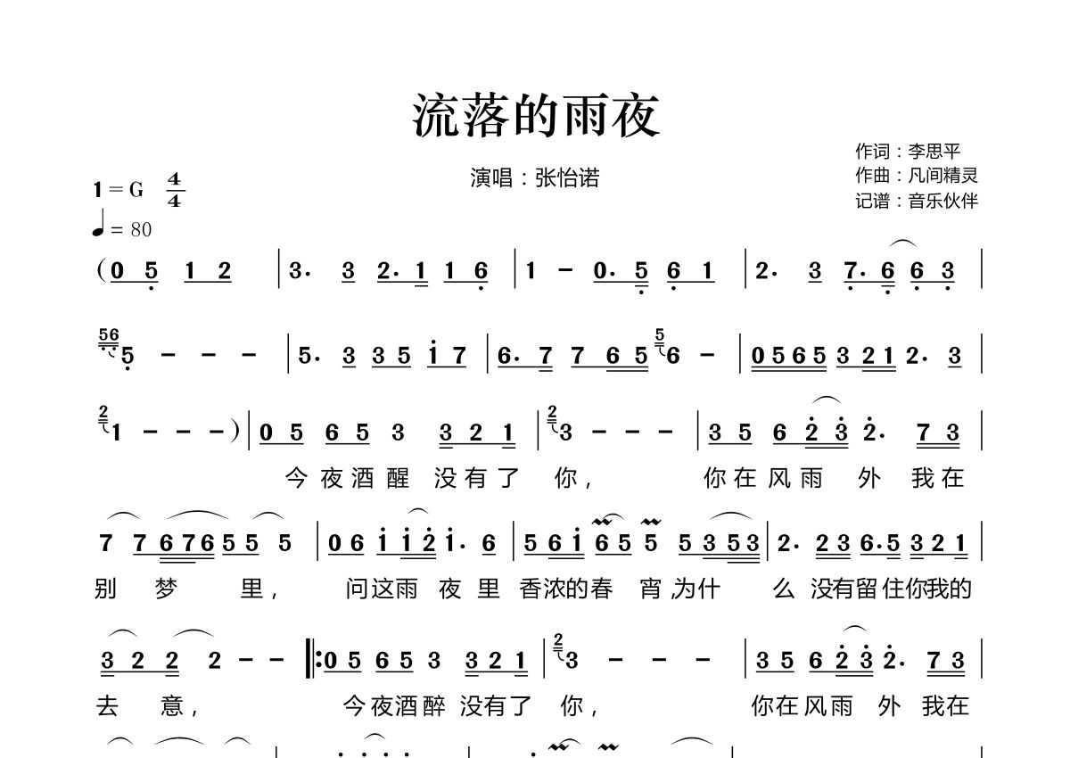 《流落的雨夜》是张怡诺演唱的一首歌曲,拍号为4/4拍,歌曲速度为每分钟80拍,这份简谱共有两张高清图谱,图谱由 @音乐伙伴 编配上传。