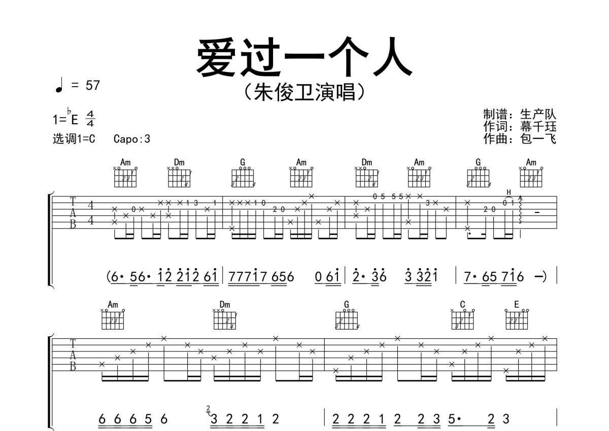 《爱过一个人》是朱俊卫演唱的一首歌曲,精编完美版,拍号为4/4拍,歌曲速度为每分钟57拍,歌曲原调为Eb调,但由于原调指法比较难,为了方便弹奏,本吉他谱采用的是C调指法编配,变调夹3品弹奏即为原调,当然也可以根据自己的音域改变变调夹位置,或者通过改变和弦调性,以方便自己弹奏,这份吉他谱共有三张高清图谱,图谱由 @生产队 编配上传,图谱使用六线谱编配,包含吉他和弦指法、简谱以及歌词部分,使用这份爱过一个人吉他谱,可以让你更加方便地掌握这首歌曲的弹唱技巧,快来尝试吧。朱俊卫演唱的歌曲《爱过一个人》原版吉他谱,精准的前奏、间奏、尾奏solo编配,精编完美版,值得推荐!。