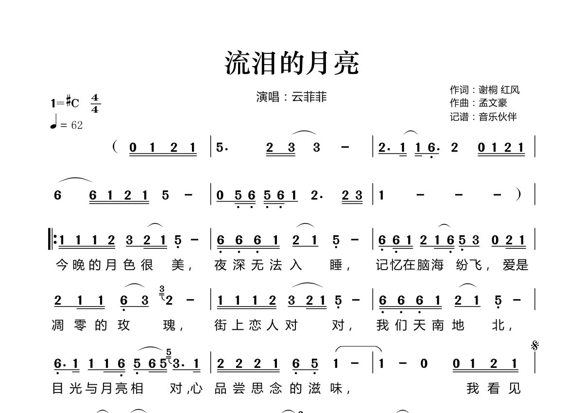 《流泪的月亮》是云菲菲演唱的一首歌曲,拍号为4/4拍,歌曲速度为每分钟62拍,这份简谱共有两张高清图谱,图谱由 @音乐伙伴 编配上传。