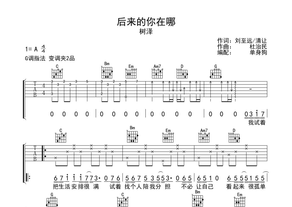树泽《后来的你在哪》吉他谱 - G调弹唱六线谱