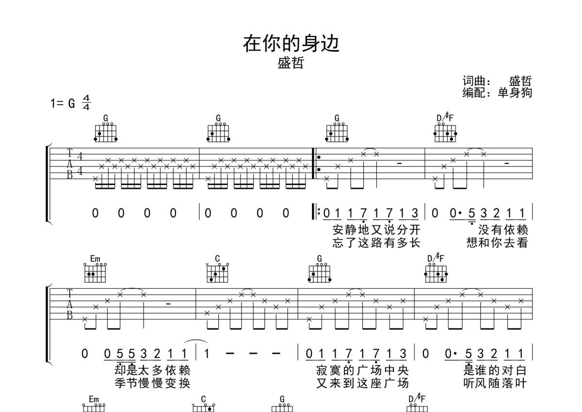 盛哲《在你的身边》吉他谱 - G调弹唱六线谱