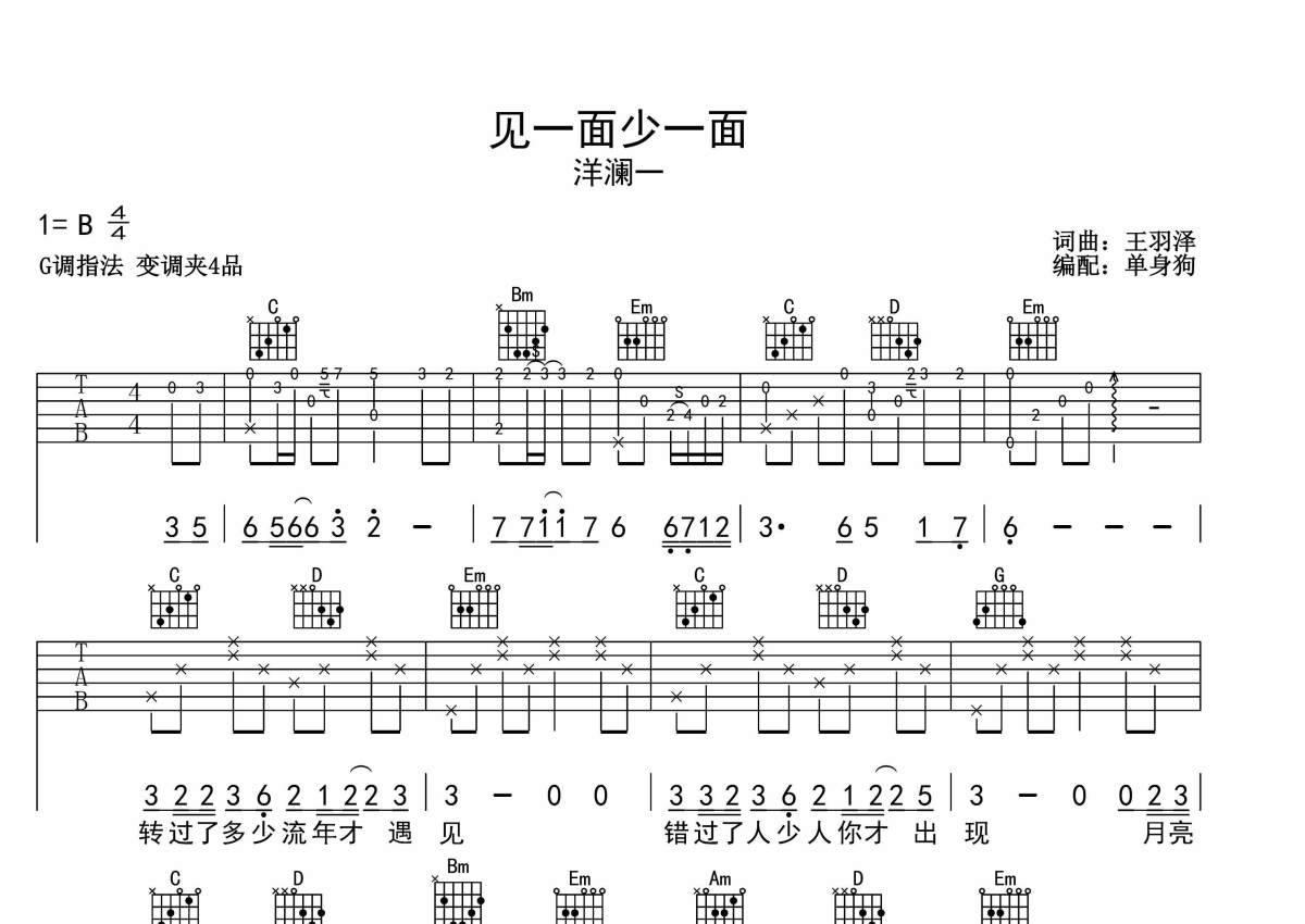 《见一面少一面》是洋澜一演唱的一首歌曲,拍号为4/4拍,歌曲原调为B调,但由于原调指法比较难,为了方便弹奏,本吉他谱采用的是G调指法编配,变调夹4品弹奏即为原调,当然也可以根据自己的音域改变变调夹位置,或者通过改变和弦调性,以方便自己弹奏,这份吉他谱共有两张高清图谱,图谱由 @单身狗 编配上传,图谱使用六线谱编配,包含吉他和弦指法、简谱以及歌词部分,使用这份见一面少一面吉他谱,可以让你更加方便地掌握这首歌曲的弹唱技巧,快来尝试吧。