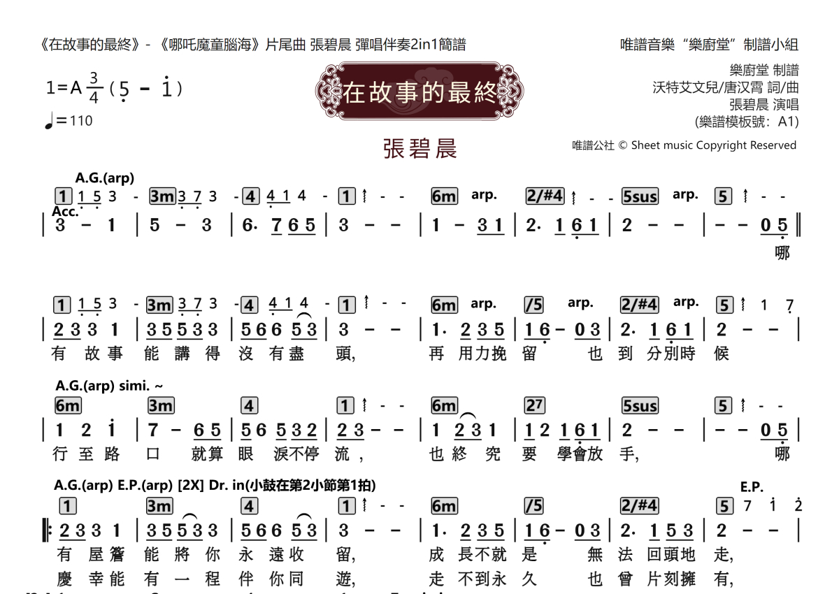 《在故事的最终》是张碧晨演唱的一首歌曲,这份乐队总谱共有两张高清图谱,图谱由 @唯谱音乐"乐厨堂"发布小组 编配上传。