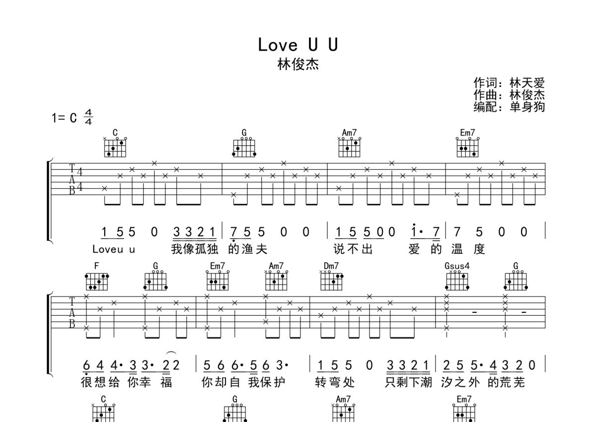 林俊杰《Love U U》吉他谱 - C调弹唱六线谱