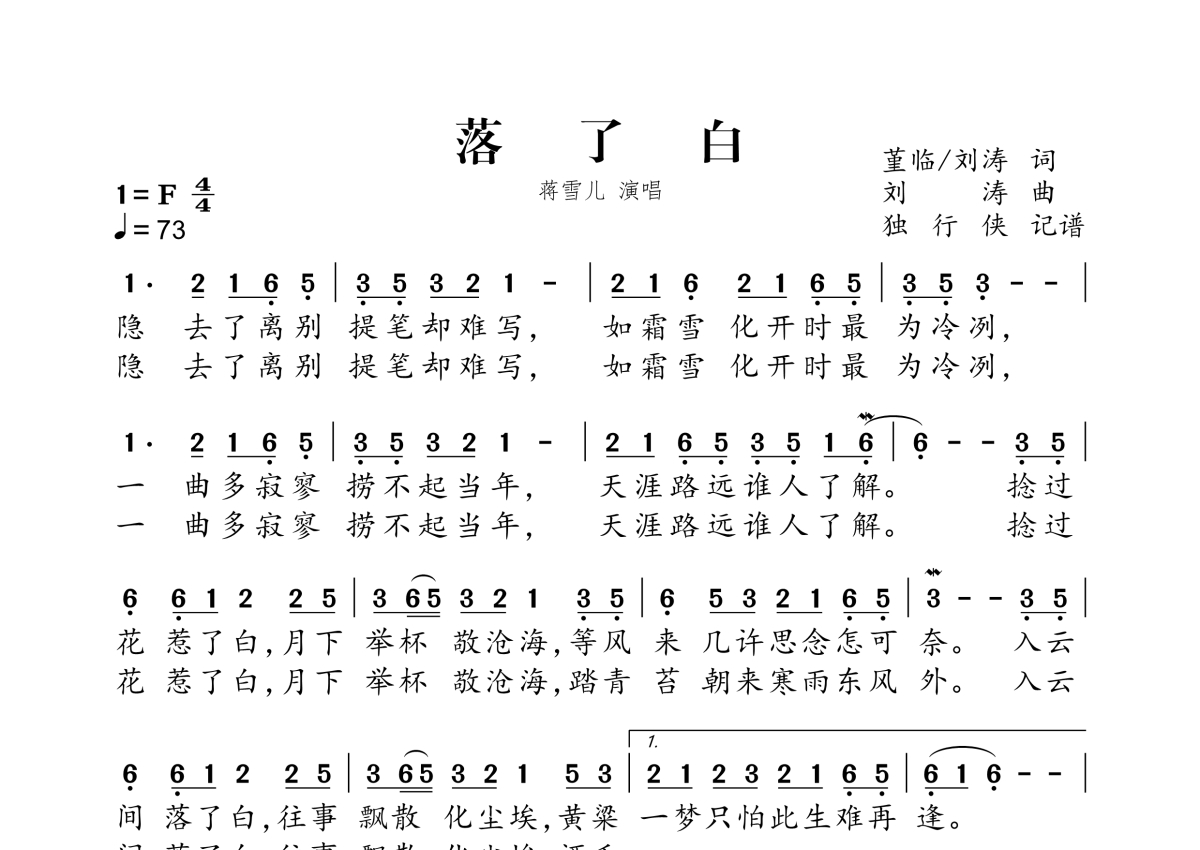 《落了白》是蒋雪儿演唱的一首歌曲,拍号为4/4拍,歌曲速度为每分钟73拍,这份简谱共有一张高清图谱,图谱由 @独行侠 编配上传。
