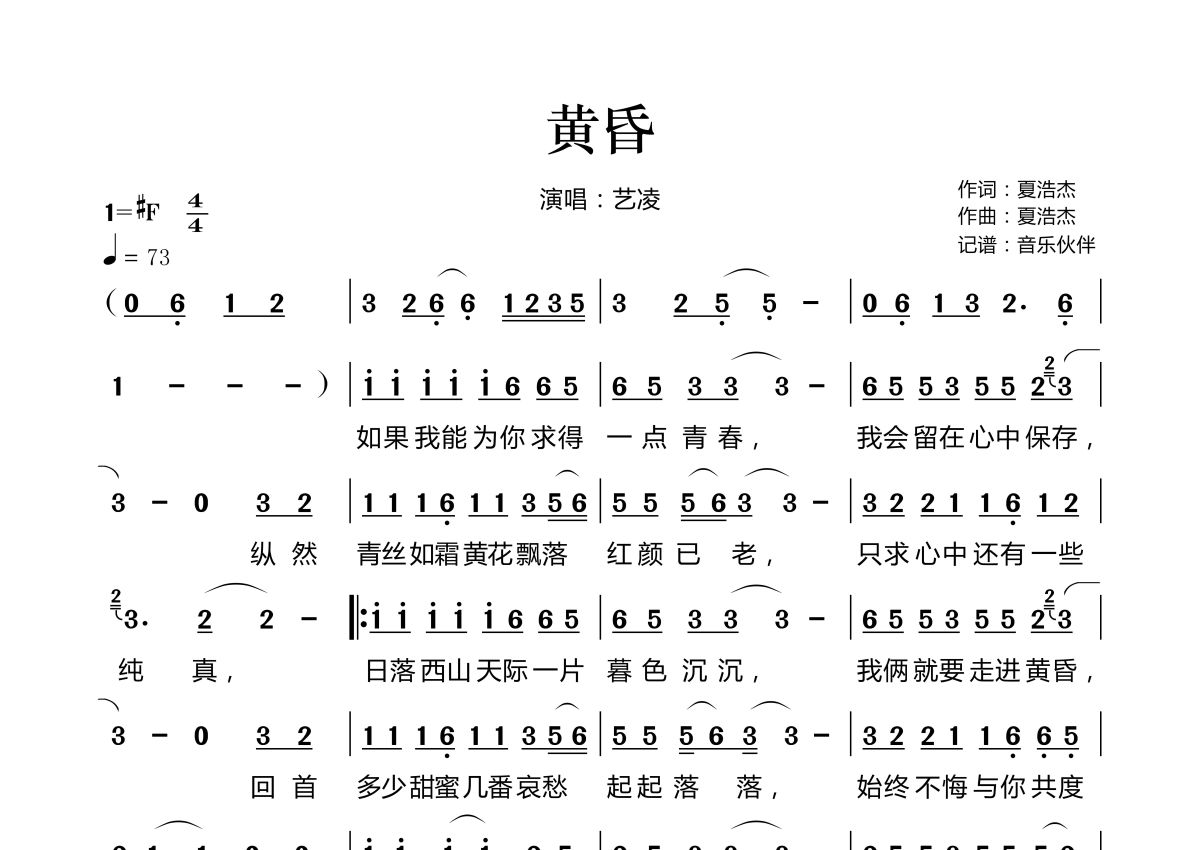 《黄昏》是艺凌演唱的一首歌曲,拍号为4/4拍,歌曲速度为每分钟73拍,这份简谱共有一张高清图谱,图谱由 @音乐伙伴 编配上传。
