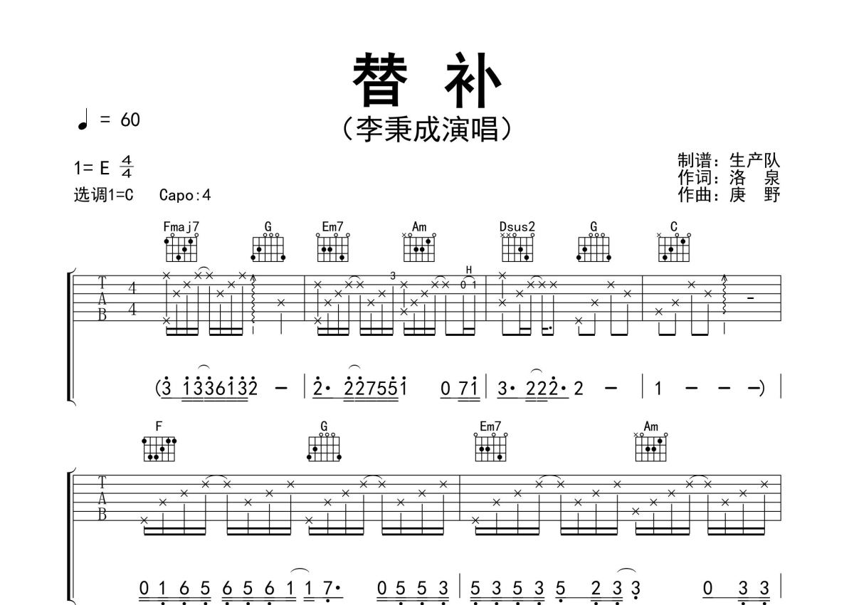 《替补》是李秉成演唱的一首歌曲,精编完美版,拍号为4/4拍,歌曲速度为每分钟60拍,歌曲原调为E调,但由于原调指法比较难,为了方便弹奏,本吉他谱采用的是C调指法编配,变调夹4品弹奏即为原调,当然也可以根据自己的音域改变变调夹位置,或者通过改变和弦调性,以方便自己弹奏,这份吉他谱共有三张高清图谱,图谱由 @生产队 编配上传,图谱使用六线谱编配,包含吉他和弦指法、简谱以及歌词部分,使用这份替补吉他谱,可以让你更加方便地掌握这首歌曲的弹唱技巧,快来尝试吧。李秉成演唱的歌曲《替补》原版吉他谱,完整的前奏、间奏、尾奏solo编配,精编完美版,值得推荐!。