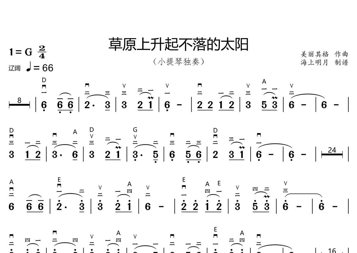 《草原上升起不落的太阳》是小提琴简谱演唱的一首歌曲,这份小提琴谱共有一张高清图谱,图谱由 @海上明月 编配上传。