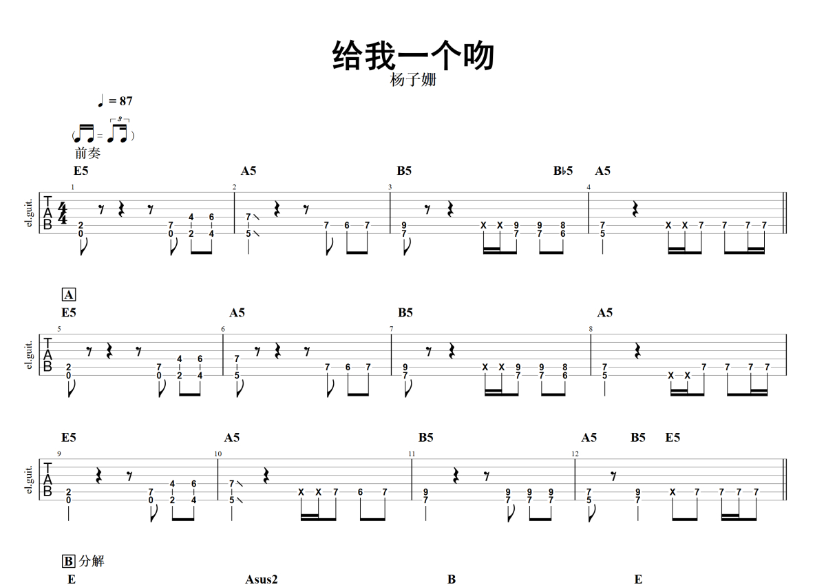 杨子姗《给我一个吻》电吉他谱 - 石头音乐原版记谱