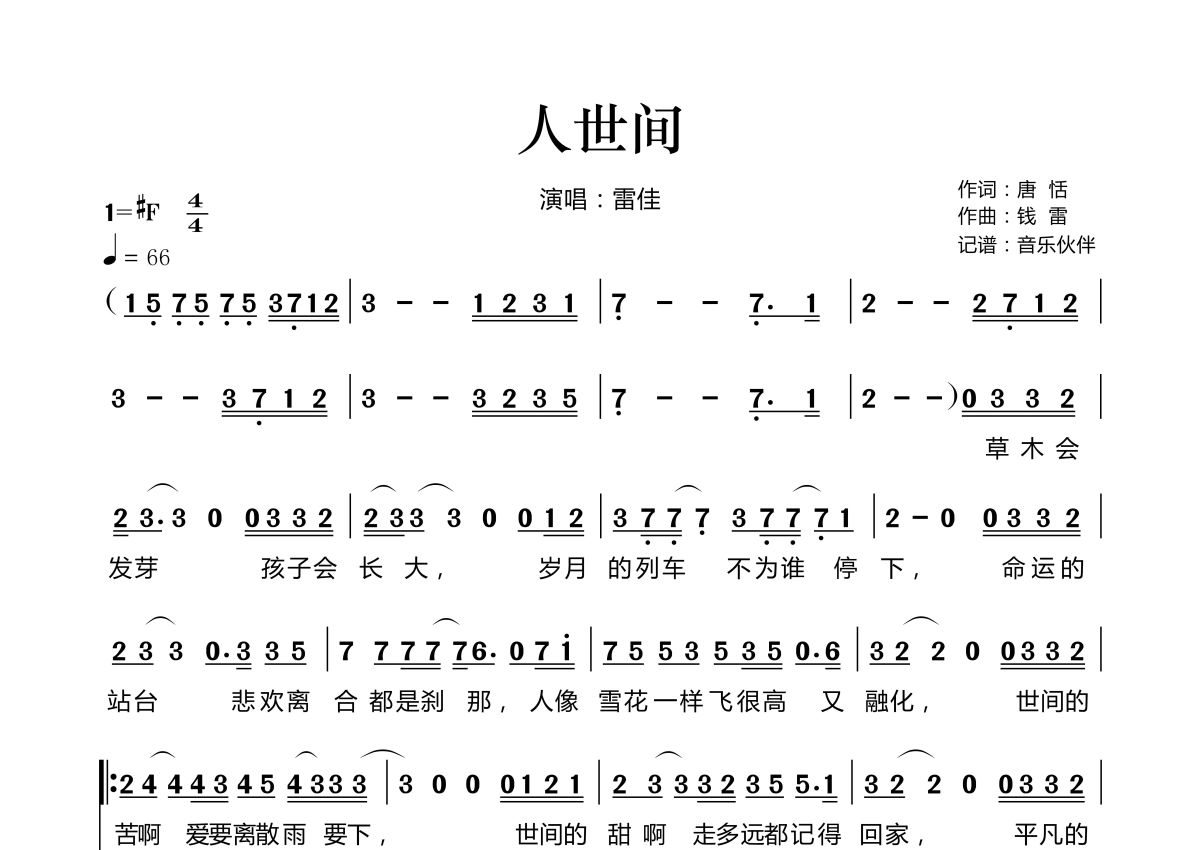 《人世间》是雷佳演唱的一首歌曲,拍号为4/4拍,歌曲速度为每分钟66拍,这份简谱共有两张高清图谱,图谱由 @音乐伙伴 编配上传。