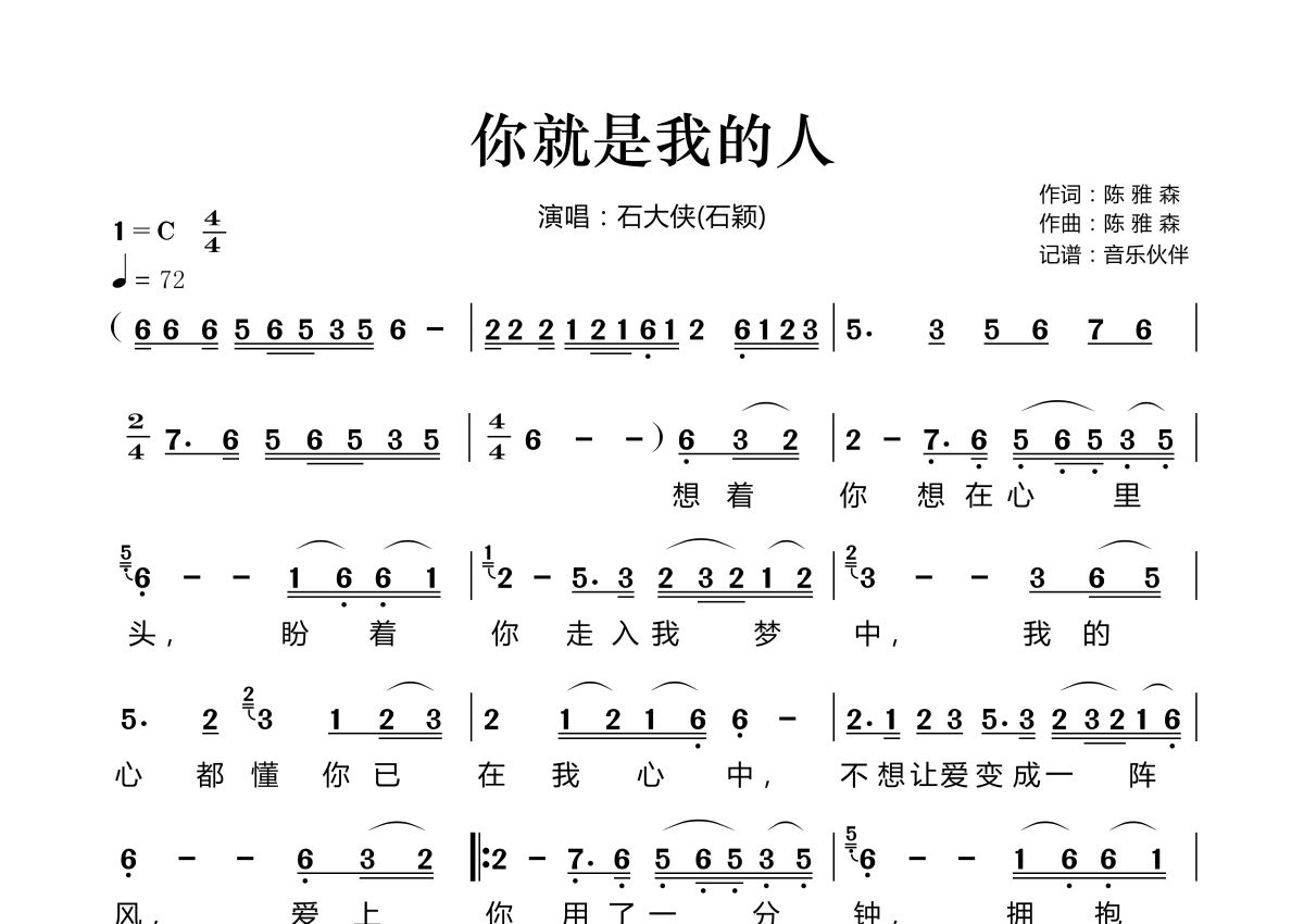 你就是我的人简谱 - 石大侠(石颖)演唱