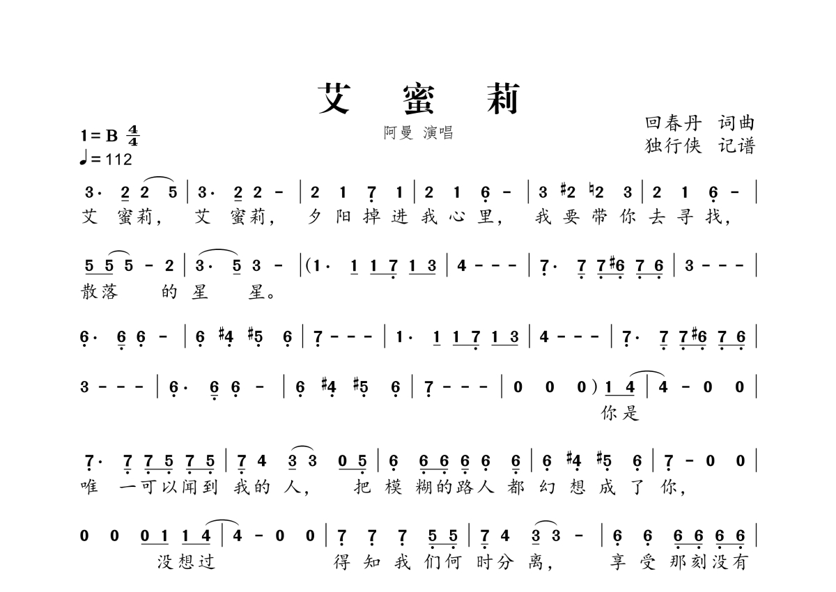 《艾蜜莉》是阿曼演唱的一首歌曲,拍号为4/4拍,歌曲速度为每分钟111拍,这份简谱共有一张高清图谱,图谱由 @独行侠 编配上传。