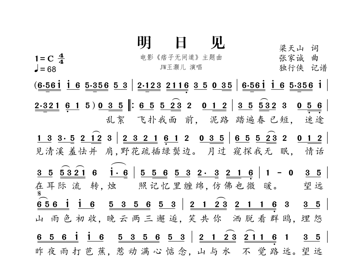 《明日见》是JW王灏儿演唱的一首歌曲,电影《痞子无间道》主题曲,拍号为4/4拍,歌曲速度为每分钟68拍,这份简谱共有一张高清图谱,图谱由 @独行侠 编配上传。