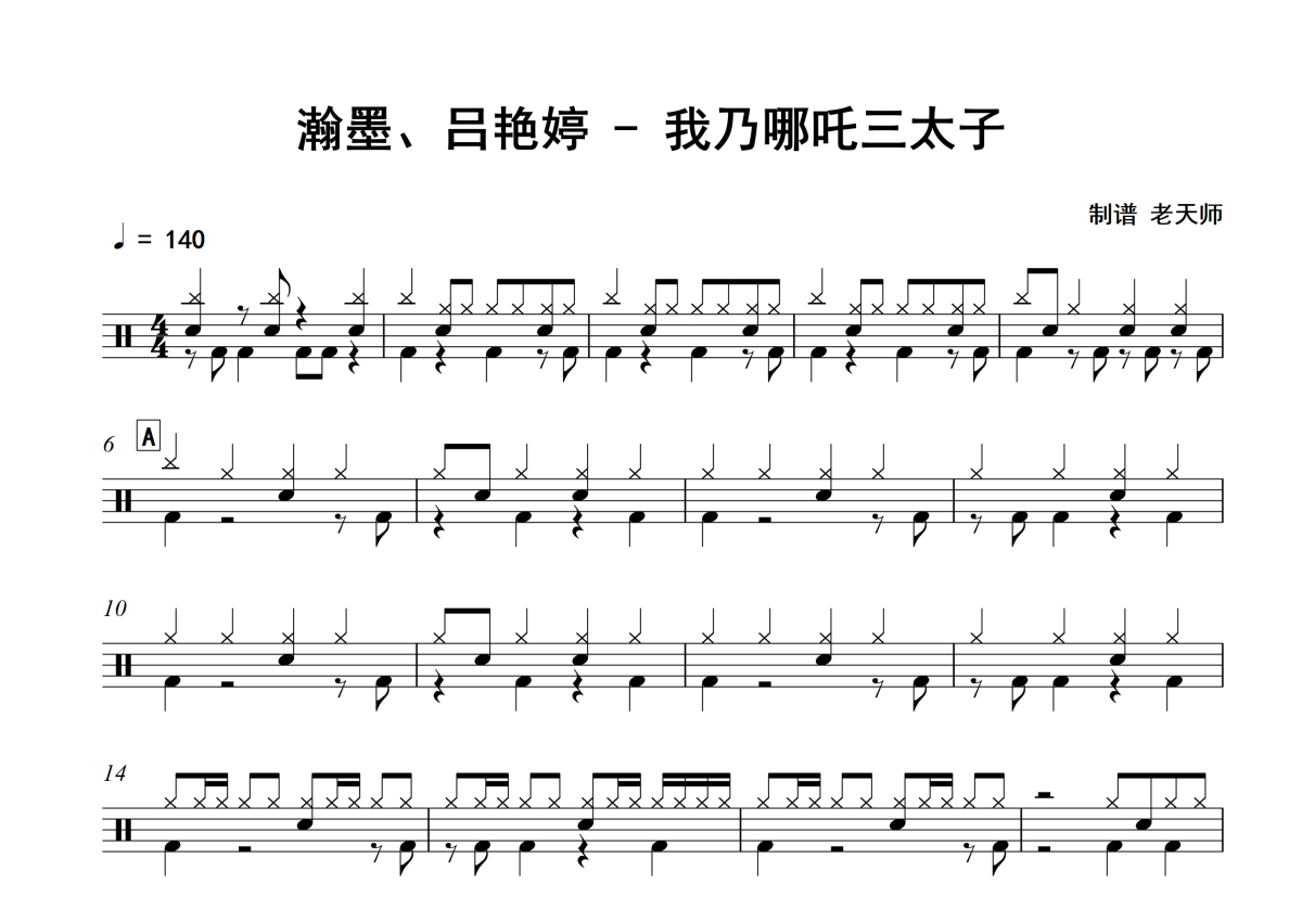 《我乃哪吒三太子》是瀚墨、吕艳婷演唱的一首歌曲,拍号为4/4拍,歌曲速度为每分钟140拍,这份架子鼓谱共有两张高清图谱,图谱由 @172****8519 编配上传,图谱使用五线谱编配,使用这份我乃哪吒三太子架子鼓谱,你将能够轻松地敲打出这首瀚墨、吕艳婷的我乃哪吒三太子,快来尝试吧。