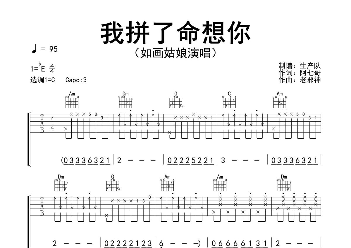 《我拼了命想你》是如画姑娘演唱的一首歌曲,精编完美版,拍号为4/4拍,歌曲速度为每分钟95拍,歌曲原调为Eb调,但由于原调指法比较难,为了方便弹奏,本吉他谱采用的是C调指法编配,变调夹3品弹奏即为原调,当然也可以根据自己的音域改变变调夹位置,或者通过改变和弦调性,以方便自己弹奏,这份吉他谱共有两张高清图谱,图谱由 @生产队 编配上传,图谱使用六线谱编配,包含吉他和弦指法、简谱以及歌词部分,使用这份我拼了命想你吉他谱,可以让你更加方便地掌握这首歌曲的弹唱技巧,快来尝试吧。如画姑娘演唱的歌曲《我拼了命想你》原版吉他谱,完整的前奏、间奏、尾奏solo编配,精编完美版,值得推荐!。