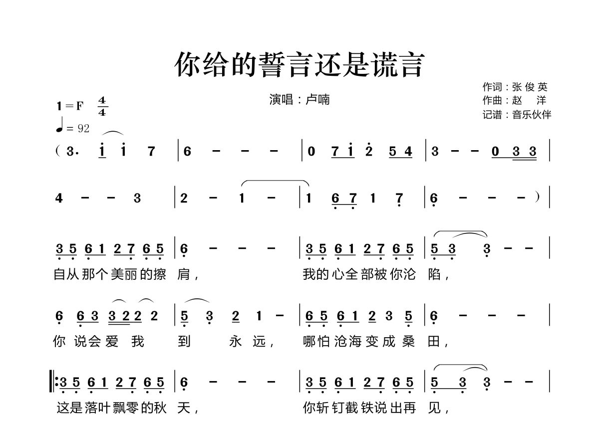 《你给的誓言还是谎言》是卢喃演唱的一首歌曲,拍号为4/4拍,歌曲速度为每分钟92拍,这份简谱共有两张高清图谱,图谱由 @音乐伙伴 编配上传。
