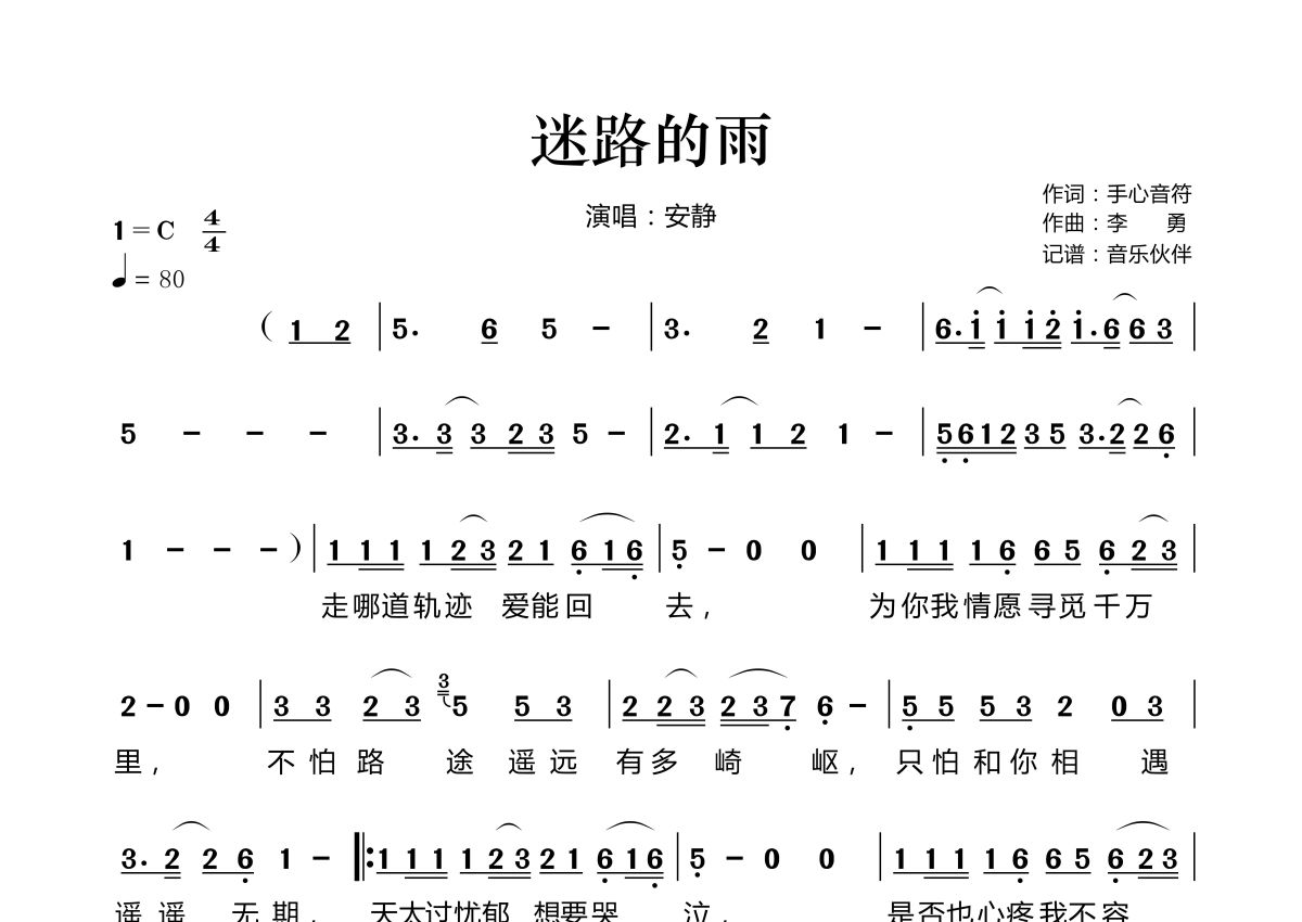 《迷路的雨》是安静演唱的一首歌曲,拍号为4/4拍,歌曲速度为每分钟80拍,这份简谱共有两张高清图谱,图谱由 @音乐伙伴 编配上传。