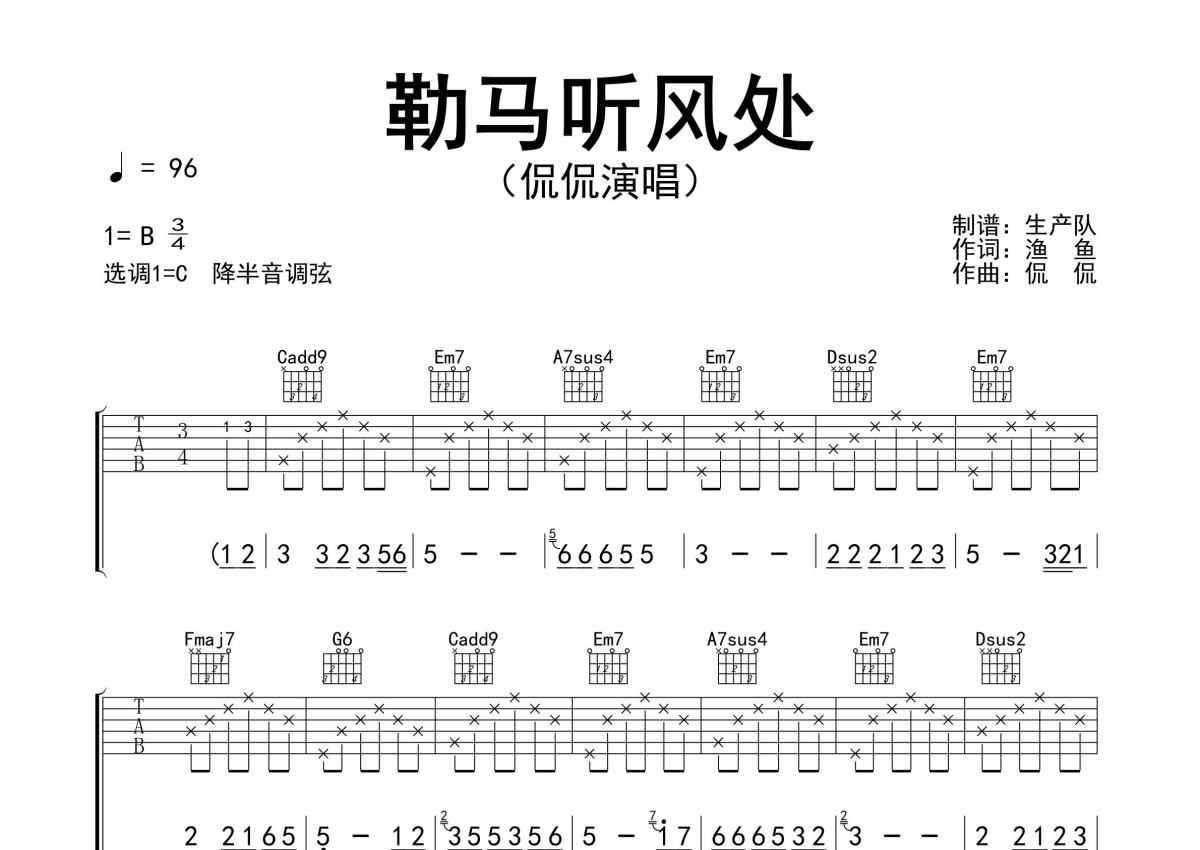 《勒马听风处》是侃侃演唱的一首歌曲,精编完美版,拍号为3/4拍,歌曲速度为每分钟96拍,歌曲原调为B调,但由于原调指法比较难,为了方便弹奏,本吉他谱采用的是C调指法编配,降半音调弦弹奏即为原调,当然也可以根据自己的音域决定是否调弦,这份吉他谱共有三张高清图谱,图谱由 @生产队 编配上传,图谱使用六线谱编配,包含吉他和弦指法、简谱以及歌词部分,使用这份勒马听风处吉他谱,可以让你更加方便地掌握这首歌曲的弹唱技巧,快来尝试吧。侃侃演唱的歌曲《勒马听风处》原版吉他谱,精准的前奏、间奏、尾奏solo编配,精编完美版,值得推荐!。