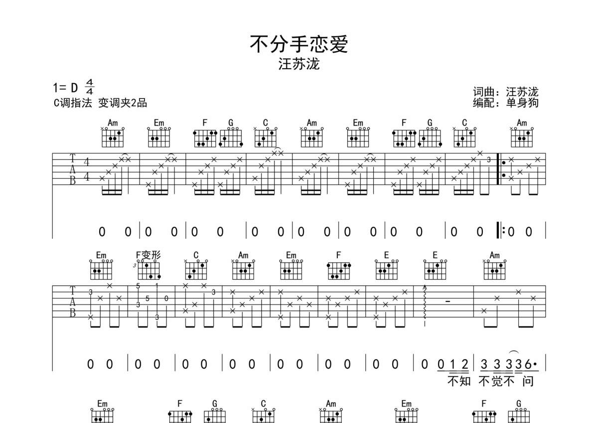 《不分手的恋爱》是汪苏泷演唱的一首歌曲,拍号为4/4拍,歌曲原调为D调,但由于原调指法比较难,为了方便弹奏,本吉他谱采用的是C调指法编配,变调夹2品弹奏即为原调,当然也可以根据自己的音域改变变调夹位置,或者通过改变和弦调性,以方便自己弹奏,这份吉他谱共有三张高清图谱,图谱由 @单身狗 编配上传,图谱使用六线谱编配,包含吉他和弦指法、简谱以及歌词部分,使用这份不分手的恋爱吉他谱,可以让你更加方便地掌握这首歌曲的弹唱技巧,快来尝试吧。