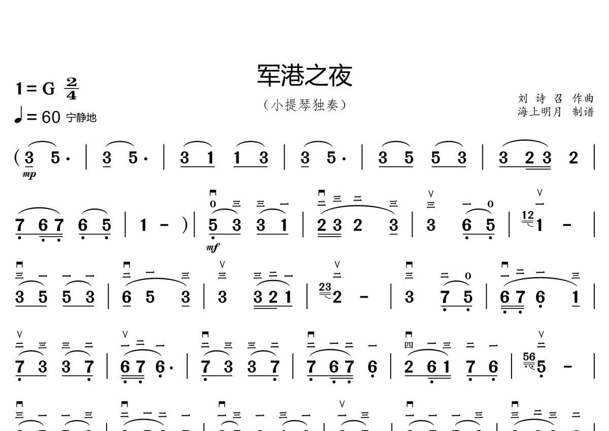 《军港之夜》是苏小明演唱的一首歌曲,这份小提琴谱共有一张高清图谱,图谱由 @海上明月 编配上传。
