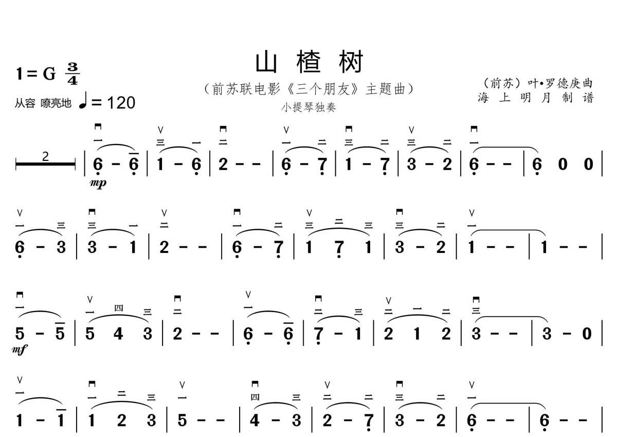 《山楂树》是前苏联歌曲演唱的一首歌曲,这份小提琴谱共有一张高清图谱,图谱由 @海上明月 编配上传。