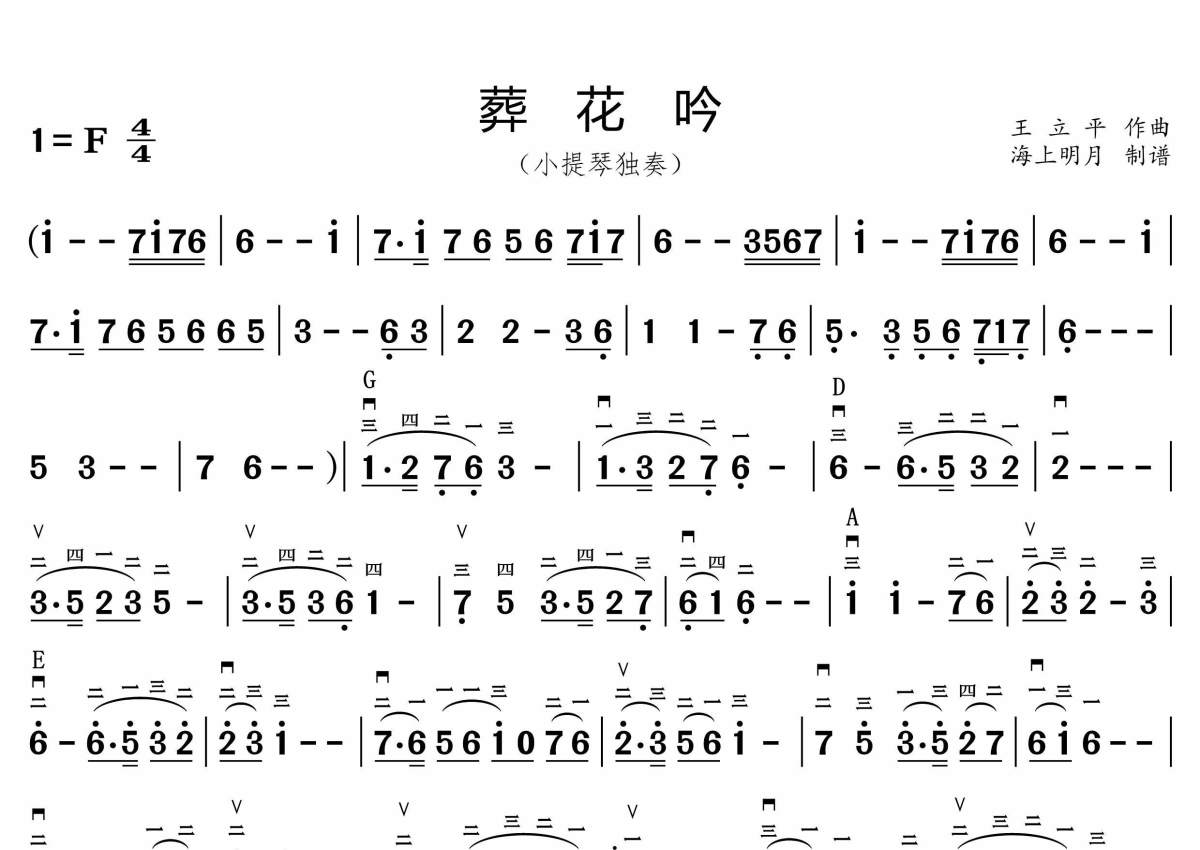 《葬花吟》是红楼梦选曲演唱的一首歌曲,简谱版,这份小提琴谱共有一张高清图谱,图谱由 @海上明月 编配上传。