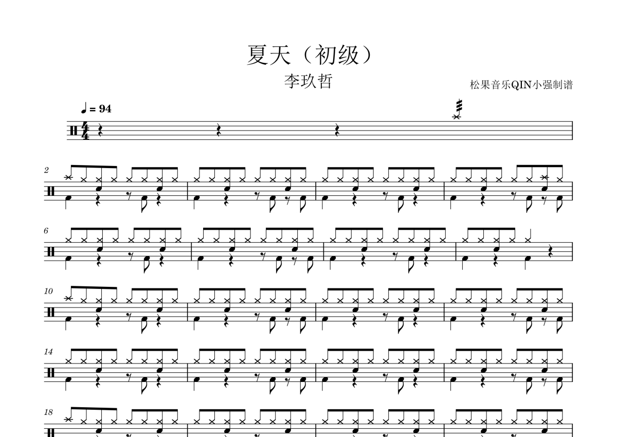 《夏天》是李玖哲演唱的一首歌曲,拍号为4/4拍,这份架子鼓谱共有两张高清图谱,图谱由 @松果音乐QIN小强 编配上传,图谱使用五线谱编配,使用这份夏天架子鼓谱,你将能够轻松地敲打出这首李玖哲的夏天,快来尝试吧。《夏天》是李玖哲演唱的歌曲,由古小力填词,周杰伦作曲,收录在李玖哲2010年发行的专辑《好玖》中。
