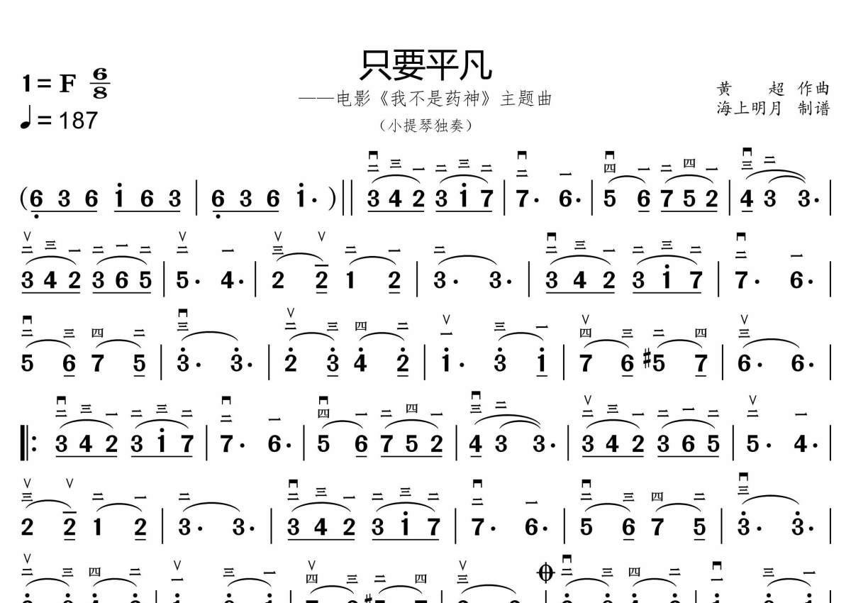 《只要平凡》是我不是药神主题曲演唱的一首歌曲,这份小提琴谱共有一张高清图谱,图谱由 @海上明月 编配上传。