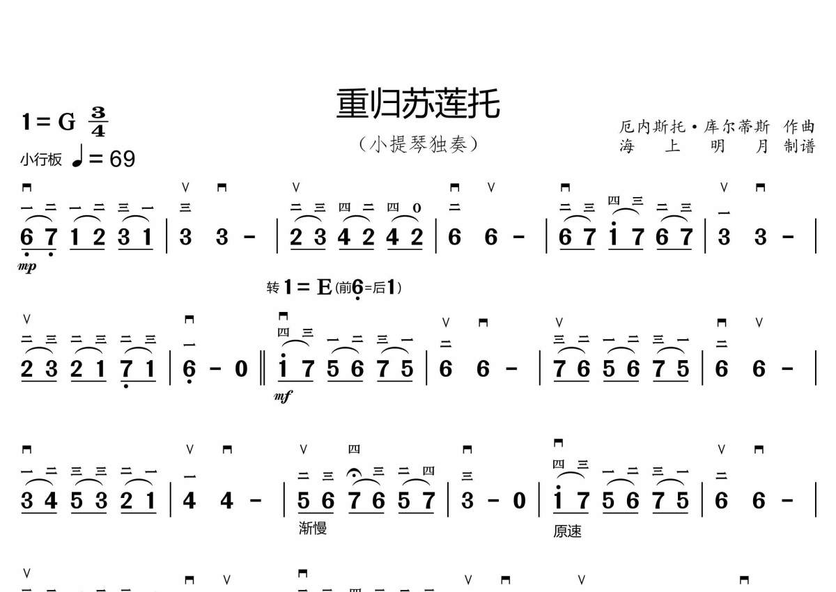 《重归苏莲托》是小提琴简谱演唱的一首歌曲,这份小提琴谱共有一张高清图谱,图谱由 @海上明月 编配上传。
