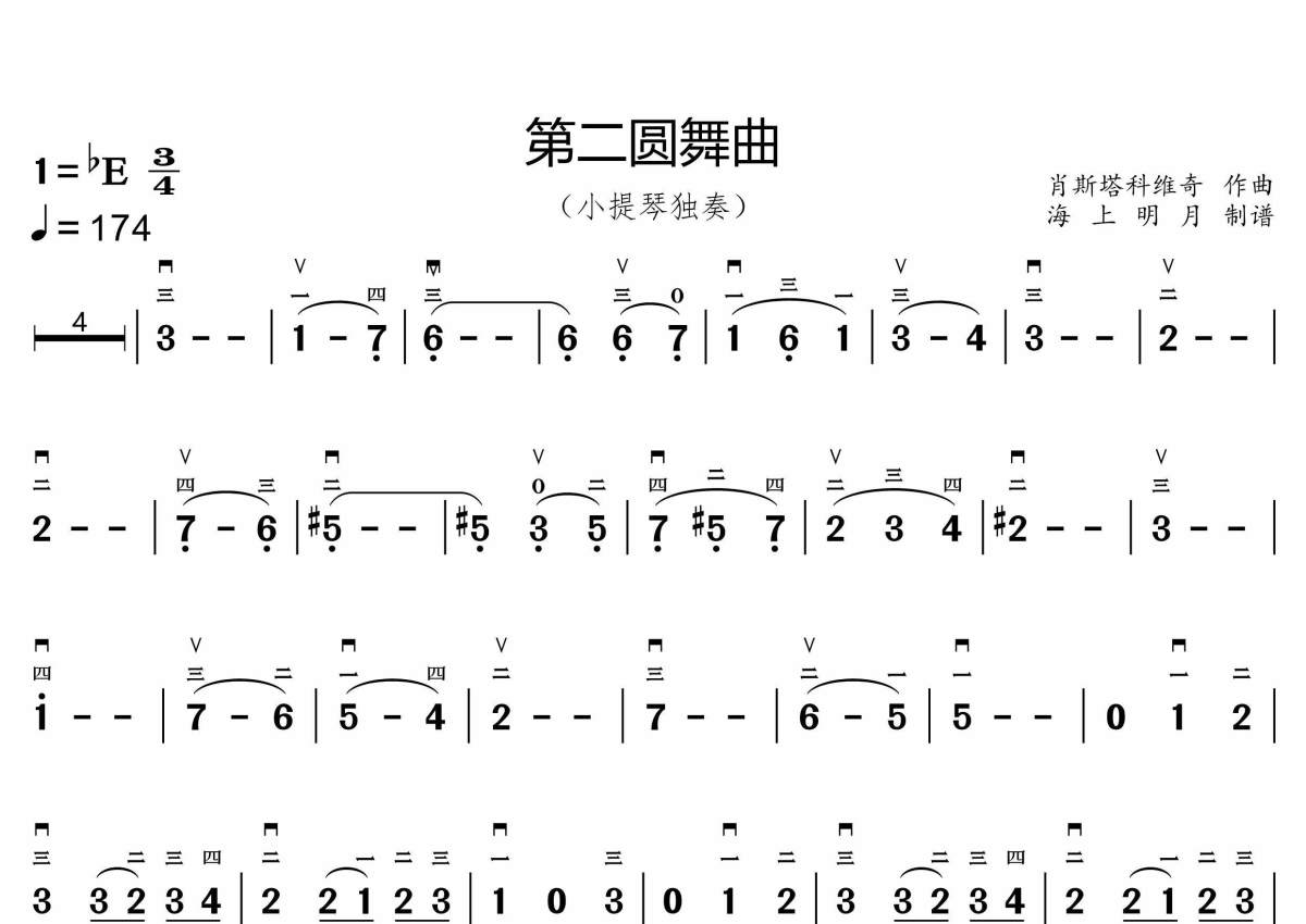 《第二圆舞曲》是肖斯塔科维奇演唱的一首歌曲,简谱版,这份小提琴谱共有两张高清图谱,图谱由 @海上明月 编配上传。