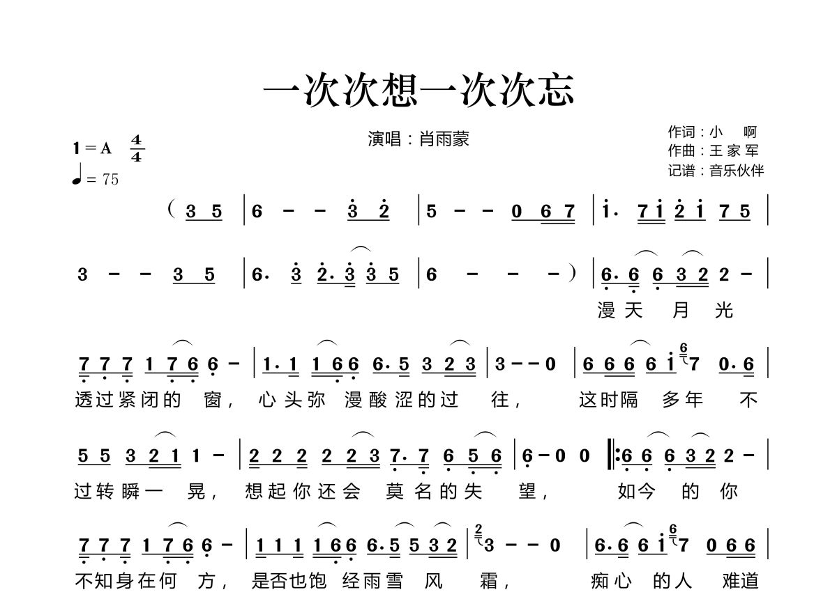 《一次次想一次次忘》是肖雨蒙演唱的一首歌曲,拍号为4/4拍,歌曲速度为每分钟75拍,这份简谱共有两张高清图谱,图谱由 @音乐伙伴 编配上传。