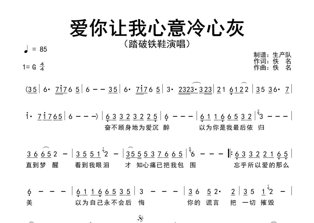 《爱你让我心意冷心灰》是踏破铁鞋演唱的一首歌曲,原版简谱,拍号为4/4拍,歌曲速度为每分钟85拍,这份简谱共有一张高清图谱,图谱由 @生产队 编配上传踏破铁鞋演唱的歌曲《爱你让我心意冷心灰》原版简谱,精准的前奏、间奏、尾奏solo编配。