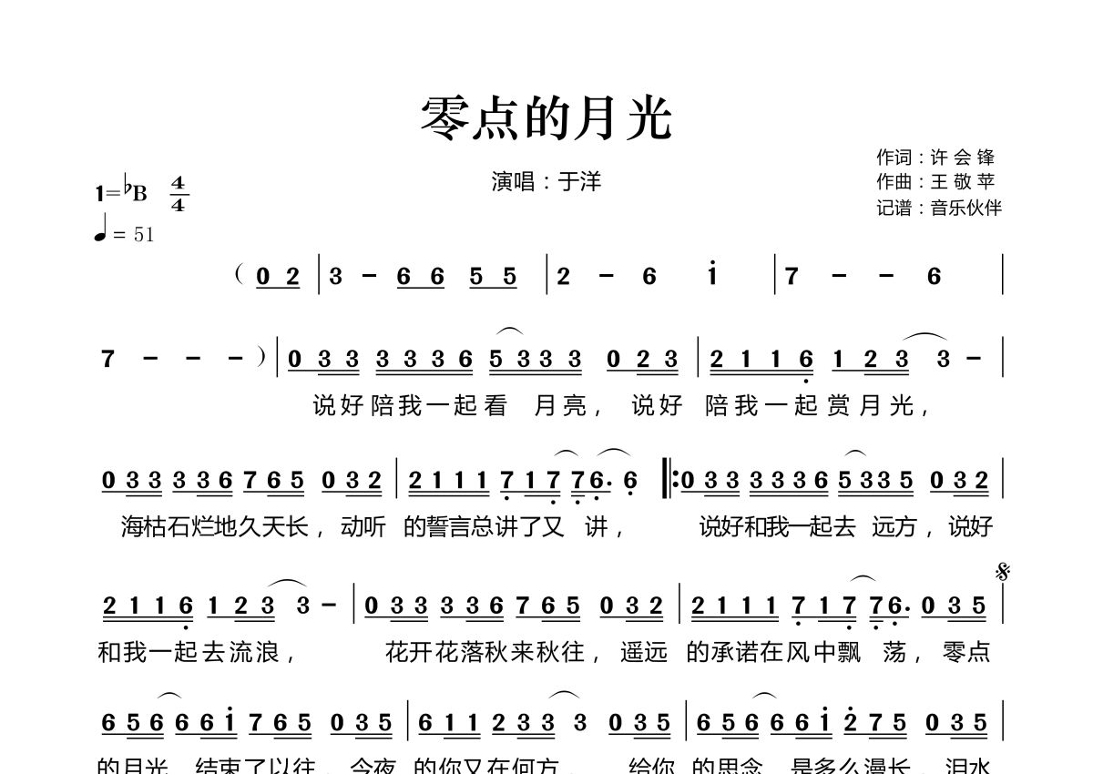 零点的月光简谱 - 于洋演唱