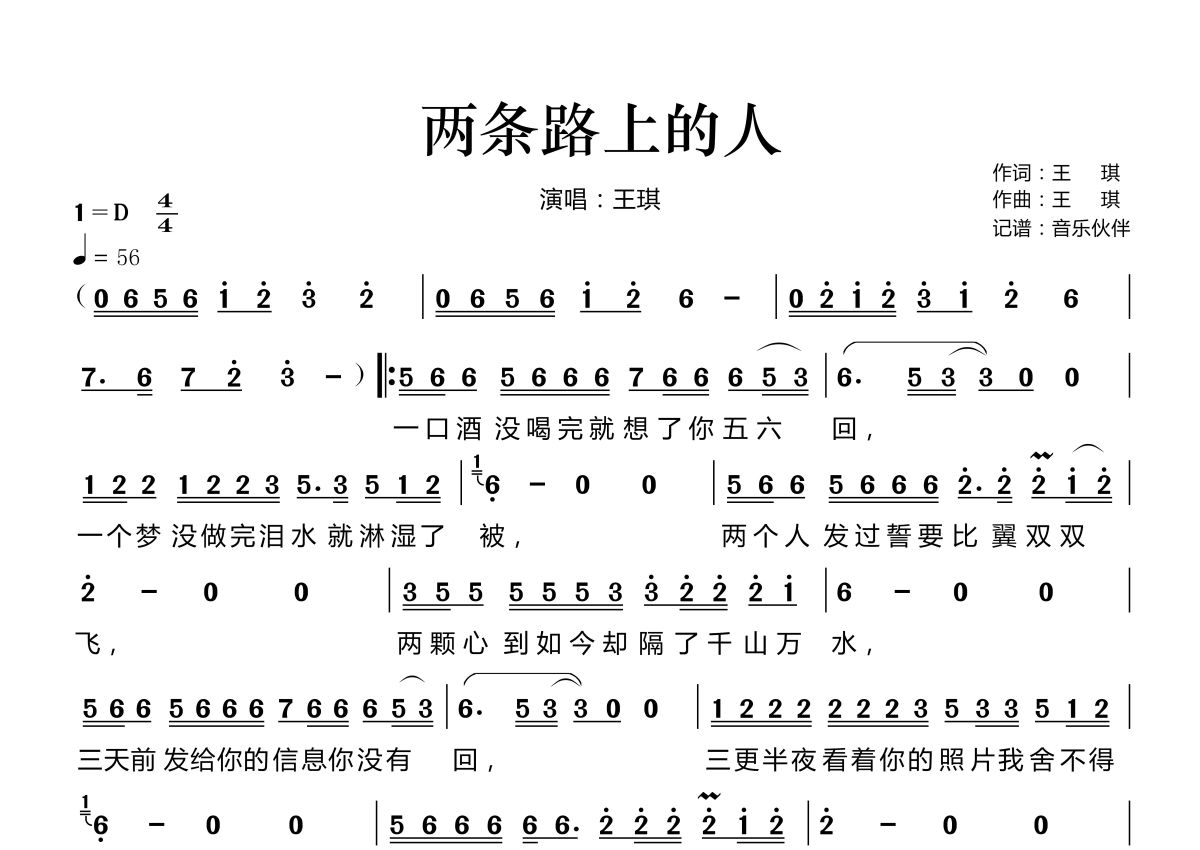 《两条路上的人》是王琪演唱的一首歌曲,这份简谱共有一张高清图谱,图谱由 @音乐伙伴 编配上传。