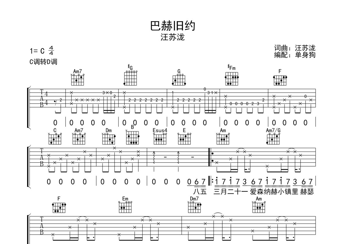 《巴赫旧约》是汪苏泷演唱的一首歌曲,本吉他谱采用的是C调指法编配,这份吉他谱共有三张高清图谱,图谱由 @单身狗 编配上传,图谱使用六线谱编配,包含吉他和弦指法、简谱以及歌词部分,使用这份巴赫旧约吉他谱,可以让你更加方便地掌握这首歌曲的弹唱技巧,快来尝试吧。汪苏泷《巴赫旧约》吉他弹唱谱,采用C调指法编配,单身狗编配出品,共有3张高清图谱。
