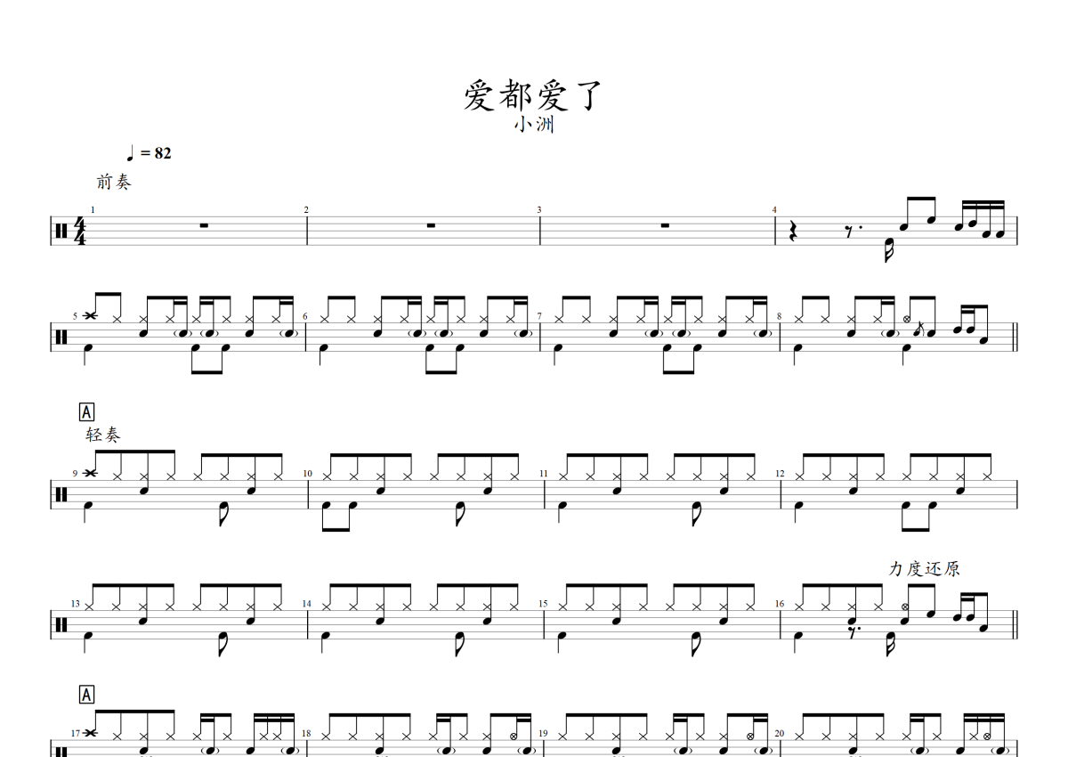 《爱都爱了》是小洲演唱的一首歌曲,拍号为4/4拍,歌曲速度为每分钟82拍,这份架子鼓谱共有两张高清图谱,图谱由 @音符喷血者 编配上传,图谱使用五线谱编配,使用这份爱都爱了架子鼓谱,你将能够轻松地敲打出这首小洲的爱都爱了,快来尝试吧。