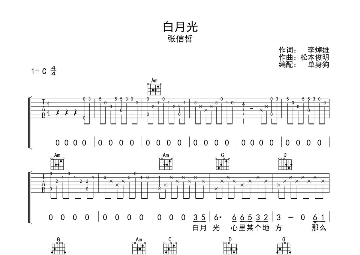 《白月光》是张信哲演唱的一首歌曲,本吉他谱采用的是C调指法编配,这份吉他谱共有三张高清图谱,图谱由 @单身狗 编配上传,图谱使用六线谱编配,包含吉他和弦指法、简谱以及歌词部分,使用这份白月光吉他谱,可以让你更加方便地掌握这首歌曲的弹唱技巧,快来尝试吧。张信哲《白月光》吉他弹唱谱,采用C调指法编配,单身狗编配出品,共有3张高清图谱。
