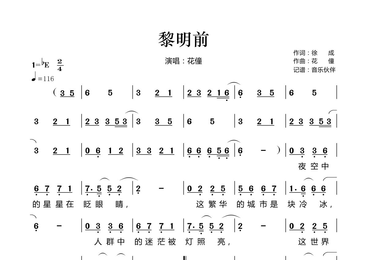 《黎明前》是花僮演唱的一首歌曲,拍号为2/4拍,歌曲速度为每分钟116拍,这份简谱共有两张高清图谱,图谱由 @音乐伙伴 编配上传。