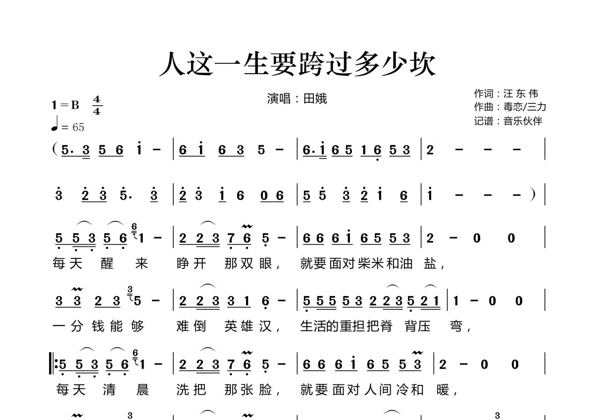 《人这一生要跨过多少坎》是田娥演唱的一首歌曲,拍号为4/4拍,歌曲速度为每分钟65拍,这份简谱共有两张高清图谱,图谱由 @音乐伙伴 编配上传。