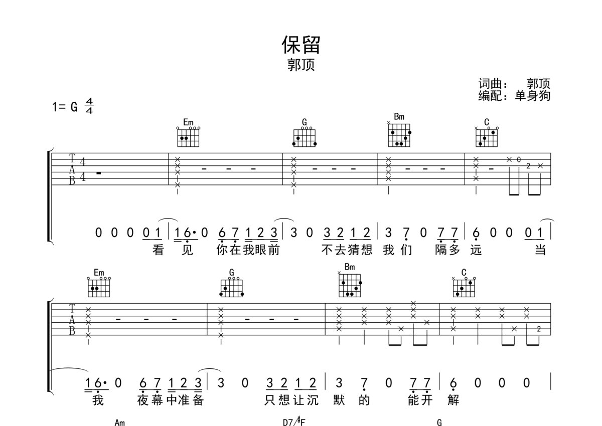 郭顶《保留》吉他谱 - G调弹唱六线谱