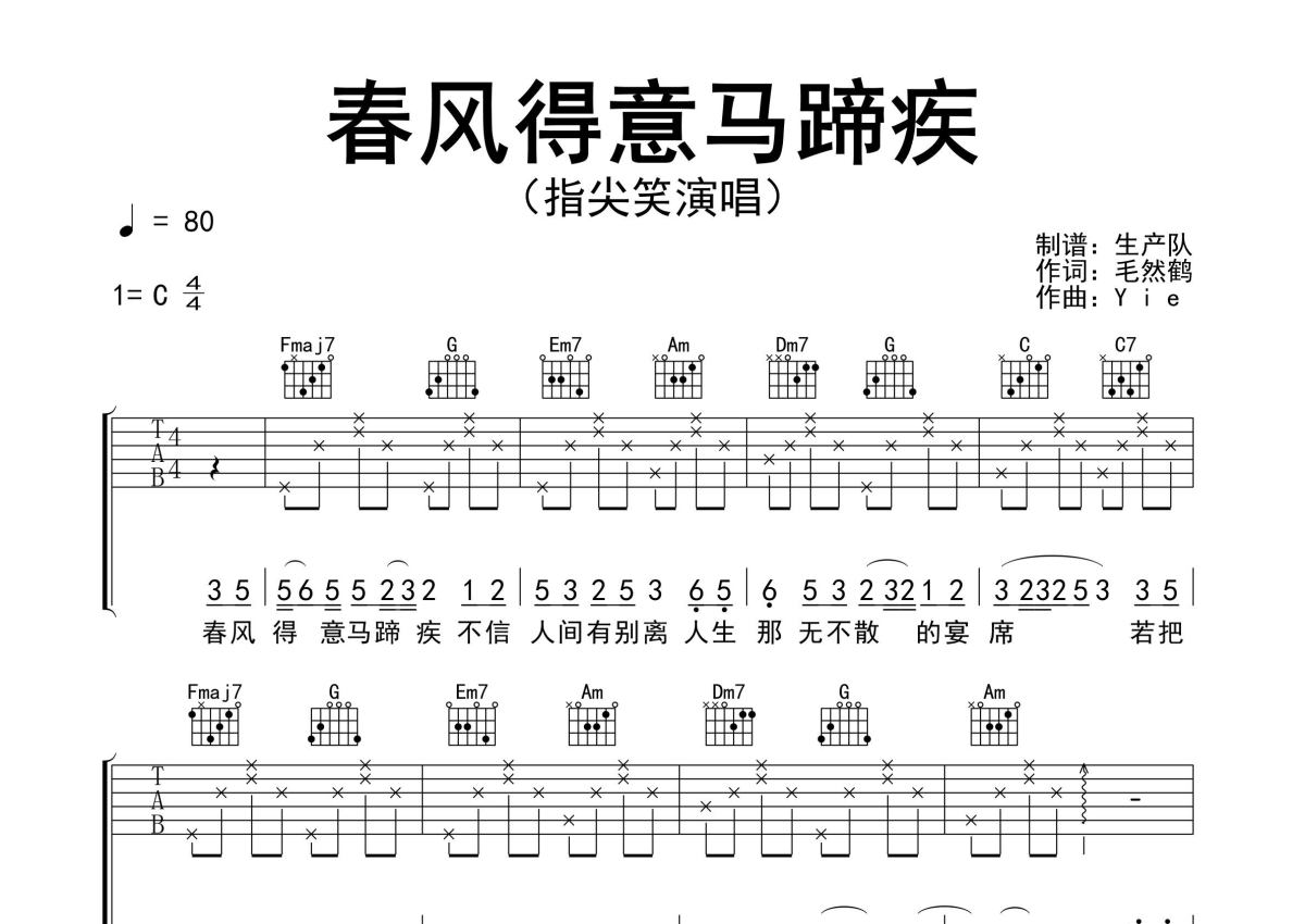 指尖笑《春风得意马蹄疾》吉他谱 - C调弹唱六线谱 - 精编完美版